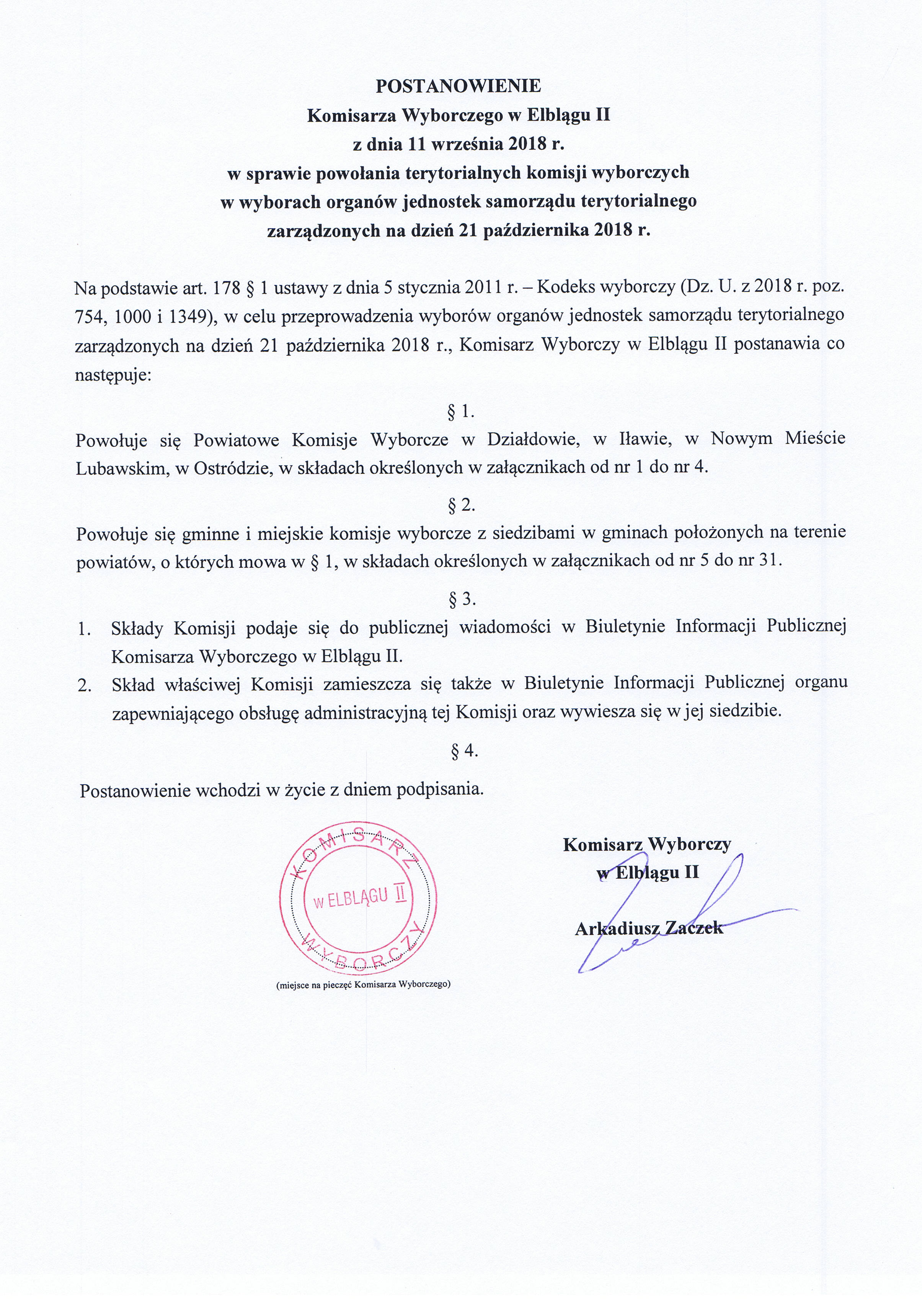 INFORMACJA - Dyżury Gminnej Komisji Wyborczej w Działdowie w dniach 20-21 października 2018 r.